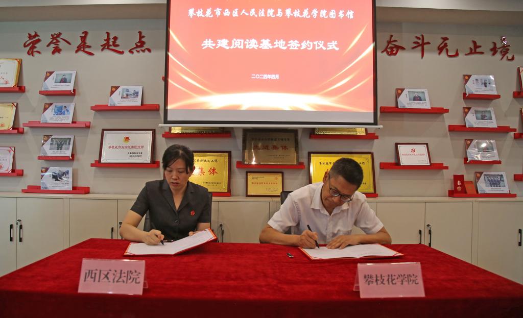 双方代表签署了《共建阅读基地协议书》。图书馆聘请了两位法官为荣誉馆员,持续开展法制进校园活动。