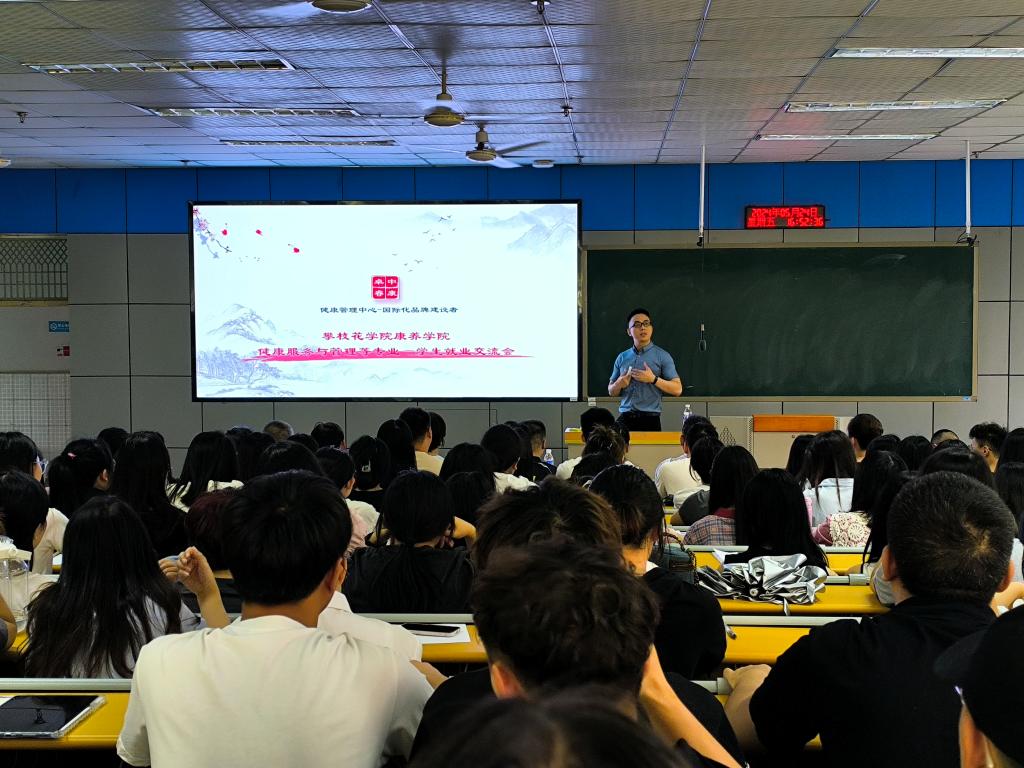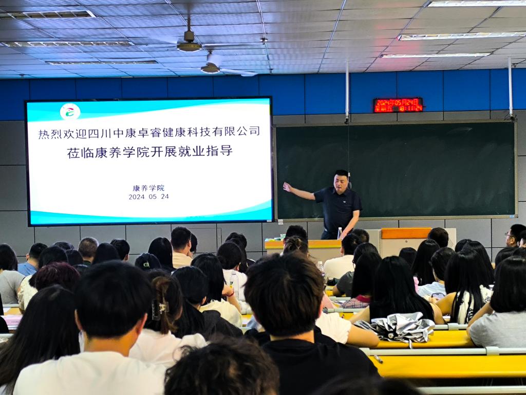 合作签约仪式后,四川中康卓睿健康科技有限公司市场学术部总监陈渝以《健康服务与管理等专业—学生就业交流会》为题,就如何提高职业竞争力、毕业后的选择、企业对健管专业人才需求定位等方面为学生开展就业指导。
