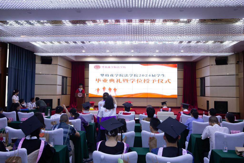 6月20日下午,法学院2024届毕业典礼暨学位授予仪式在学府酒店三楼多功能厅隆重举行。校党委副书记、纪委书记彭徐,副校长朱云生,攀枝花市检察院常务副检察长但镗宏、法学院班子成员、各科室负责人、全体教师、2024届毕业生代表、毕业生家长代表参加典礼。典礼由副院长(主持工作)杨开华主持。