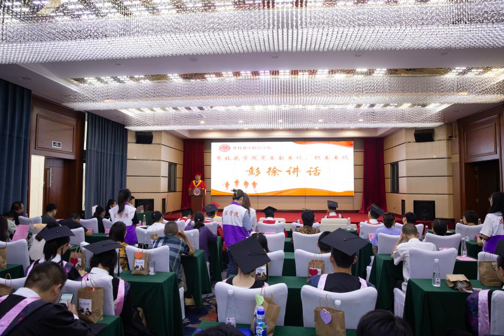 典礼上,彭徐作题为《聚散有时未来可期》毕业致辞。他向即将踏上人生新征程的136名法学院毕业生表示最热烈的祝贺!感谢同学们在最美好的年华,选择了攀大法学院。他希望同学们顺应时代,准确识变,做“与时偕行”的行者;逐梦未来,创造改变,做“奋发图强”的强者;砥砺品格,矢志不变,做“向善守仁”的仁者;拥抱生活,积极应变,做“激流勇进”的勇者。一段攀大法学路,一生攀大法学情。金沙水长,攀枝花开,母校母院始终与你们心手相牵、血脉相连;祝福同学们带着攀大法学人的骄傲与梦想,向着未来,勇敢出发!