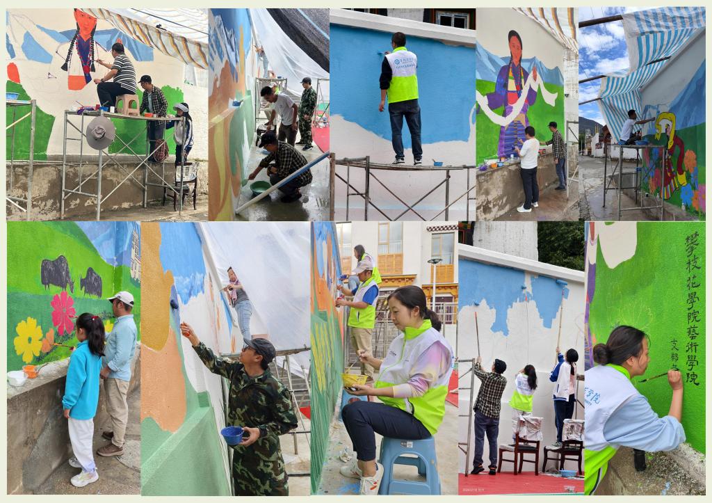 7月9日至13日,艺术学院副院长(主持工作)孙载斌带队一行9人赴乡城县开展对口帮扶和支部共建活动。为马色村绘制了将近200平米的精彩墙绘,将马色村的自然风光、传统文化、勤劳人民等元素融入到墙绘作品中,为马色村打造了一道靓丽的风景线,受到了当地群众和领导的高度认可。