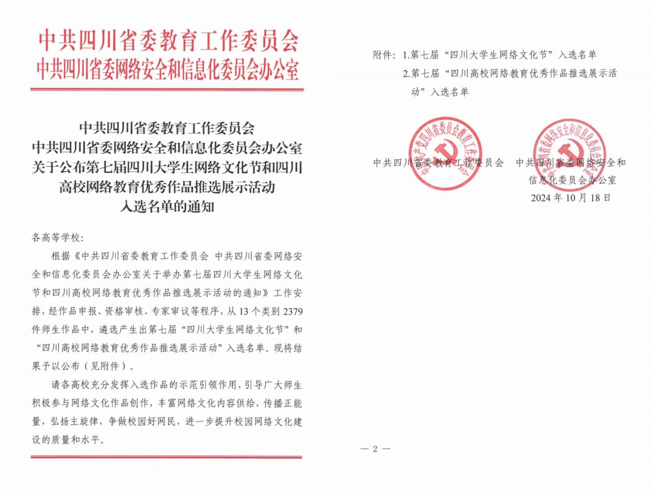 近日,由中共四川省委教育工作委员会、中共四川省委网络安全和信息化委员会办公室主办的第七届四川大学生网络文化节和四川高校网络教育优秀作品推选展示活动遴选结果揭晓,beat365师生创作的网络文化作品荣获二等奖1项,三等奖3项。