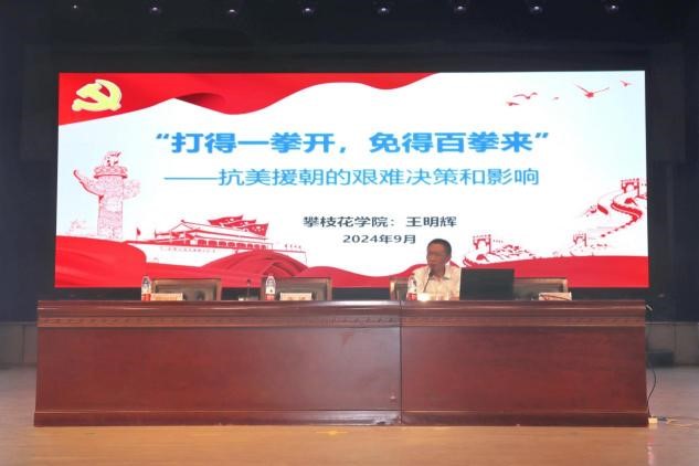 关工委梁志军老师以《强国复兴勇担使命》为题从攀枝花的城市担当、攀大的办学担当及阳光健康美丽攀大人的青年担当三个部分进行讲解,增强了同学们爱攀荣攀、爱校荣校的使命感和责任感。