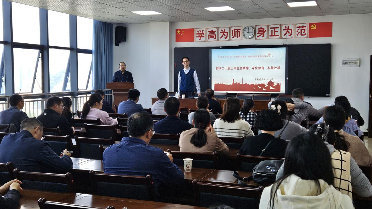 党的二十届三中全会是中国共产党在新时代新征程上,坚定不移高举改革开放旗帜、紧紧围绕推进中国式现代化进一步全面深化改革召开的一次十分重要的会议。11月21日下午,生化学院(农学院)党委邀请学校党的二十届三中全会精神宣讲团成员马克思主义学院王立平老师在产教融合大楼1605室以“贯彻党的二十届三中全会精神,深化教育、科技改革”为题,带领学院全体教职工进一步深入学习党的二十届三中全会精神。