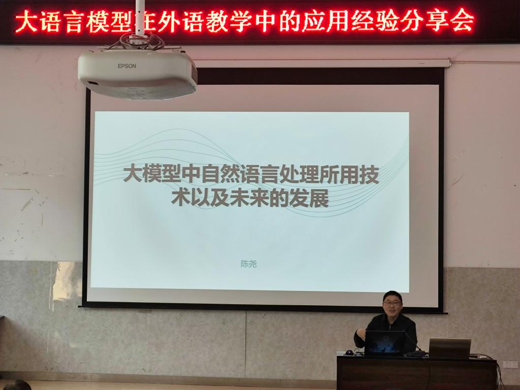 会议邀请了教务处副处长、人工智能领域专业研究人员陈尧讲解了大语言模型的技术路径与发展趋势。学院教师代表依次分享了 Kimi和文心一言在外语教学与研究中的应用案例,展示了外语教学智能体的创建及应用成果,以及超星大模型在大学英语教学中的创新应用等精彩内容。