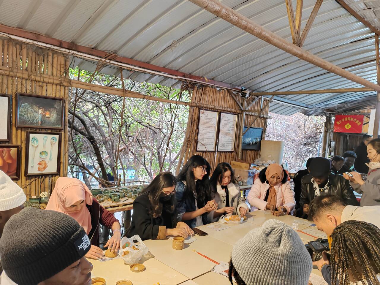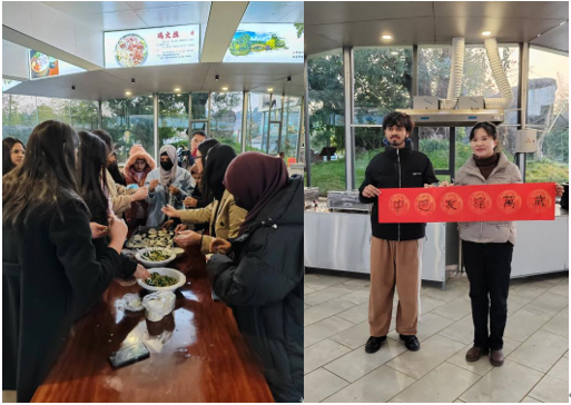在现代农业科技园,来华留学生们和老师们一起写春联、包饺子。