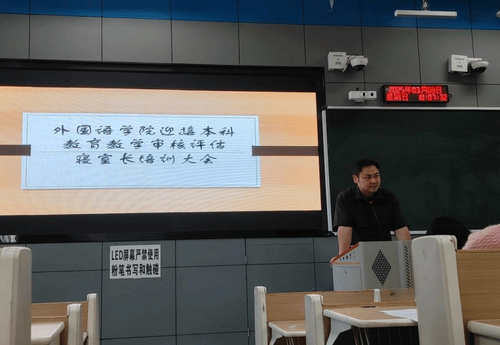 为深入贯彻落实学校本科教育教学审核评估工作要求,进一步提升学院学生社区管理水平,营造优良学风和育人环境,3月9日,外国语学院在志学楼1-101隆重召开外国语学院迎接本科教育教学审核评估寝室长培训大会。学院党委副书记张健,自律部、办公室负责人及全体寝室长参加会议。