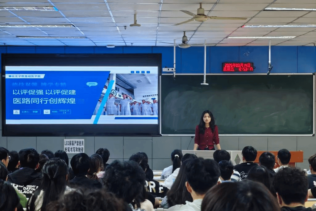会议围绕学生群体在审核评估中的角色与任务展开。分团委书记李静作动员讲话,强调审核评估是深化教学改革、提升育人质量的关键环节。她指出,全体学生要深刻理解“以评促强、以评促建、以评促改、以评促管”的内涵,以高度的责任感和使命感落实迎评工作,从课堂纪律、学风建设、文明素养等方面展现医学院学子积极向上的精神风貌。