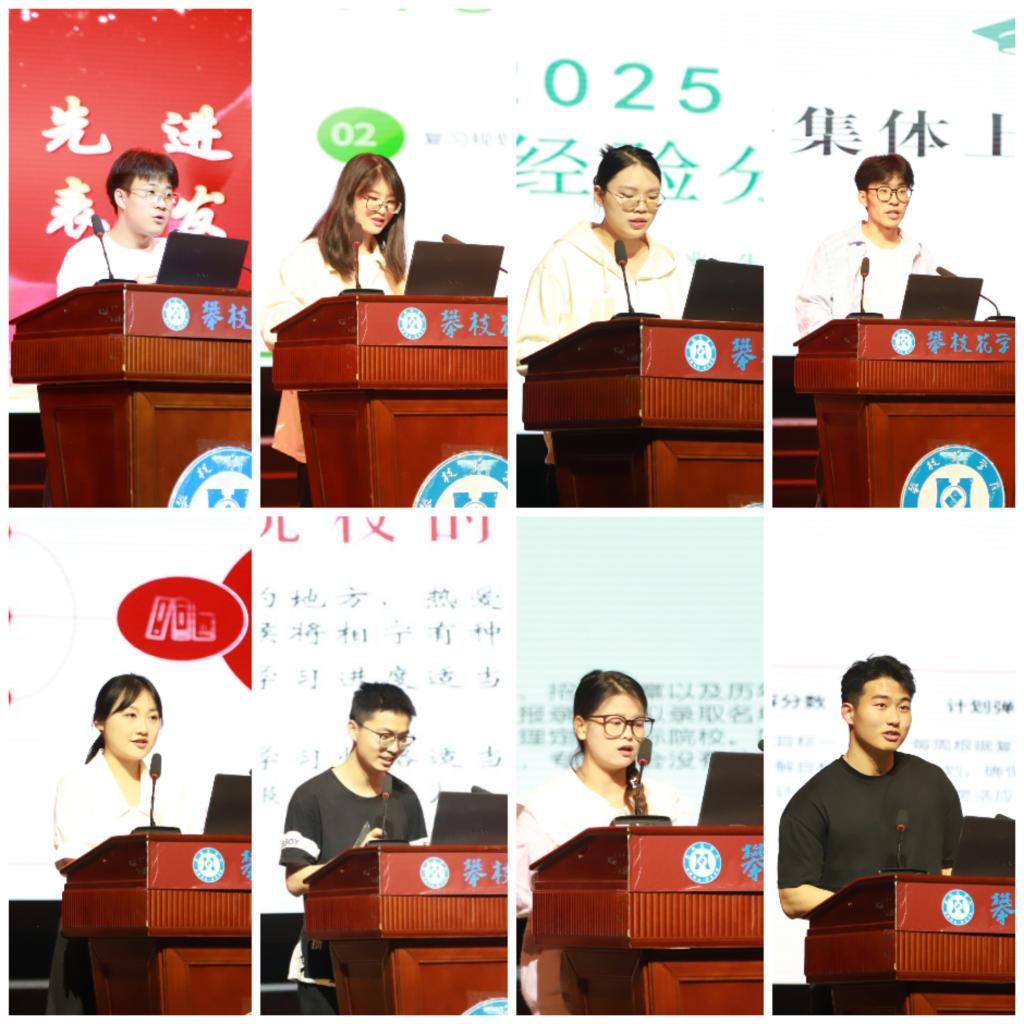 考研经验分享环节,考研先进集体代表学生黄兴睿分享班级52.5%上岸经验;寝室全员上岸代表分享宿舍成员如何集体备考、营造“考研共同体”寝室氛围,集体上岸的故事;6位专业学生代表从学生干部如何平衡工作和学习、退伍复学考研、如何上岸985、专业课高分秘诀、英语、政治备考时间规划等方面开展经验分享。