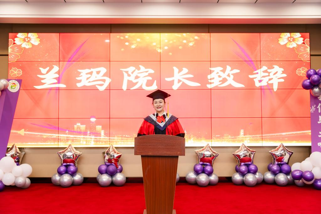 典礼伊始,康养学院院长兰玛发表致辞。她向顺利完成学业的2025届同学们致以热烈的祝贺和美好的祝愿!向倾心从教、倾情爱生的老师们和望子成龙的家长们致以崇高的敬意!她在致辞中回顾了毕业生的在校时光,表扬了在考研、入伍、创业等方面表现突出的康养学子。勉励同学们在未来的工作岗位上立志向、练本领、有情怀、敢担当, 怀揣专业的学识,秉持博爱的胸怀,续写精彩的华章!春风化雨般的话语,满含眷恋与不舍,欣慰与自豪,祝福与期许……让全场温情涌动,师生动容。