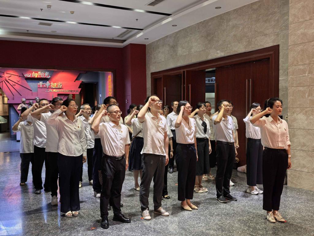 627日下午,党委书记王鹃带领教师党员参观中国三线建设博物馆,她带领全体同志面向鲜红的党旗,紧握右拳,重温入党誓词。誓言铿锵,党员教师们立志把“不忘初心牢记使命”作为教书育人终身课题。