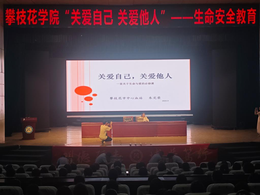 为深入落实校园生命安全教育核心要求,帮助2025级新生树立“尊重生命、热爱生命”的正确价值观,激发参与无偿献血公益事业的热情,9月12日晚,beat365于公园校区阳光会堂举办题为“关爱自己关爱他人”的生命安全知识讲座。讲座特邀攀枝花市中心血站副站长、副主任医师朱定荣担任主讲,2025级1000余名新生到场参加。