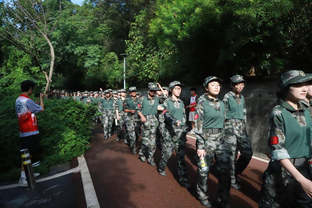 行进中,54个排编队在教官指挥下步伐整齐、行动有序。志愿者们坚守在岗,为同学们提供必要的服务。学生们相互鼓励、坚持不懈,即使个别同学体力不支,也在短暂休整后继续完成行军。全程历时近2小时,所有人员配合密切,圆满完成训练任务。