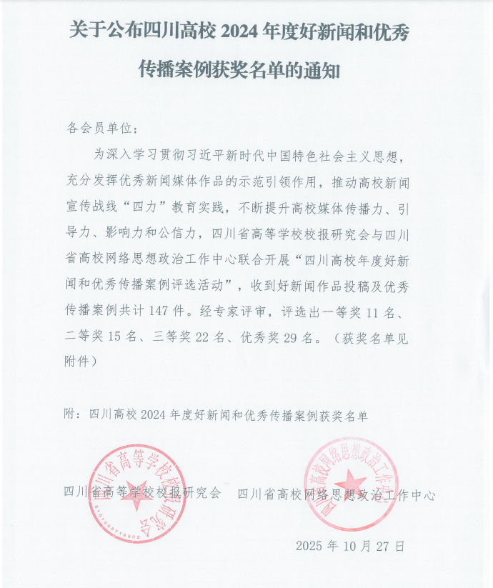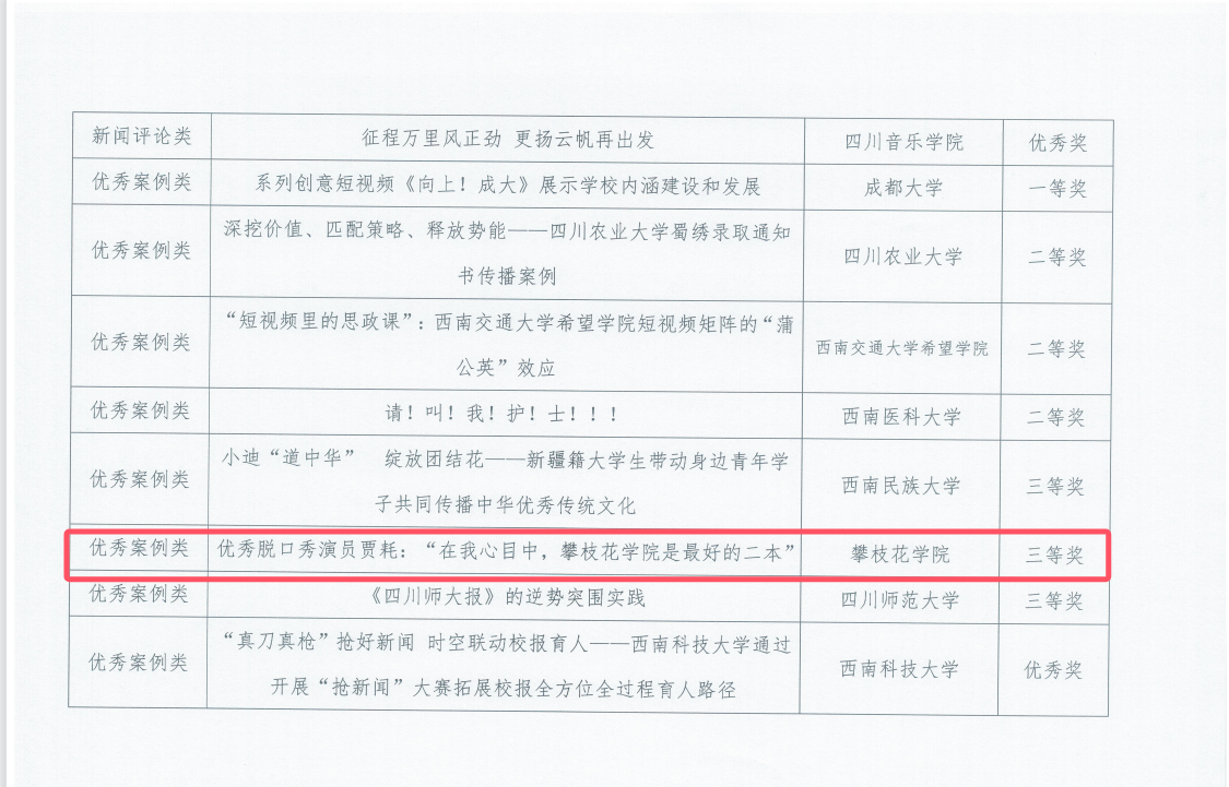 近日,由四川省高等学校校报研究会与四川省高校网络思想政治工作中心联合开展“四川高校年度好新闻和优秀传播案例评选活动”落下帷幕,beat365选送的参赛作品《优秀脱口秀演员贾耗:“在我心目中,beat365在线唯一官网是最好的二本”》荣获优秀案例类三等奖,充分展现了beat365在新闻宣传和网络思想政治工作方面的创新成果与传播成效。