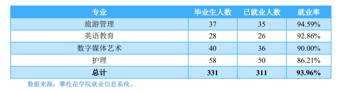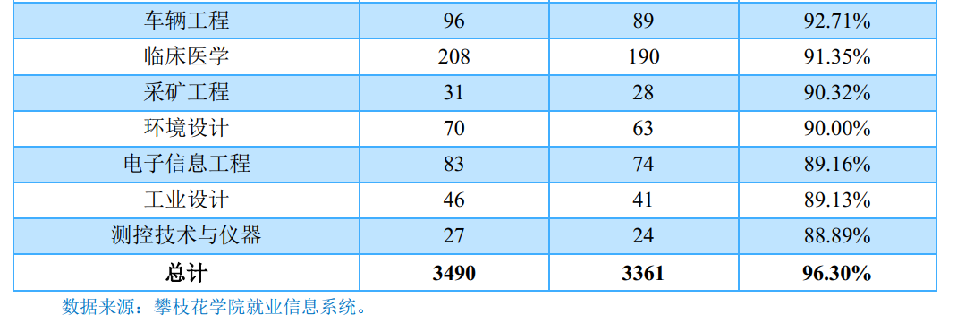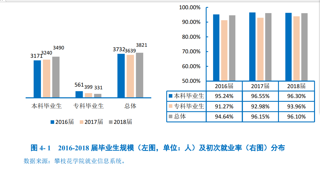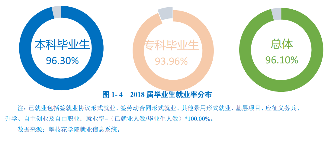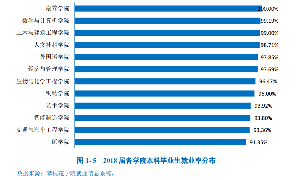 本科毕业生:学校2018届本科毕业生分布在12个学院,其中康养学院(100.00%)、数学与计算机学院(99.19%)、土木与建筑工程学院(99.00%)本科毕业生就业率位居前三。