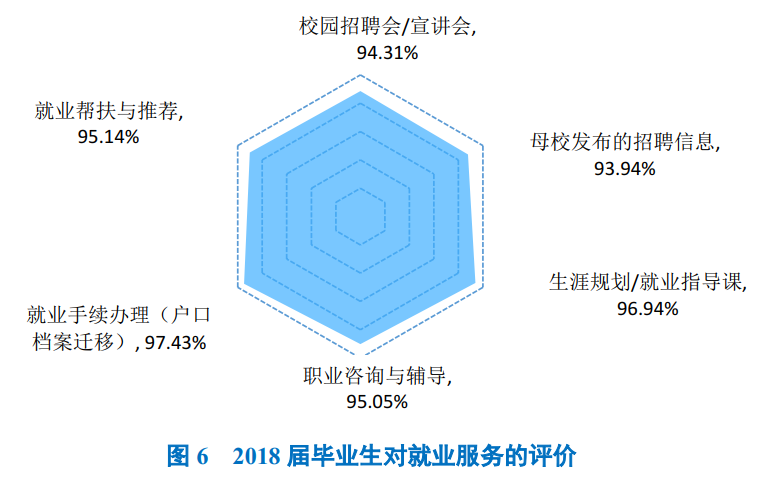 学校2018届毕业生对学校各项就业指导服务的满意度均在93.00%以上;其中对“就业手续办理(户口档案迁移等)(97.43%)”、“生涯规划/就业指导课”(96.94%)和“就业帮扶与推荐”(95.14%)的满意度相对较高。