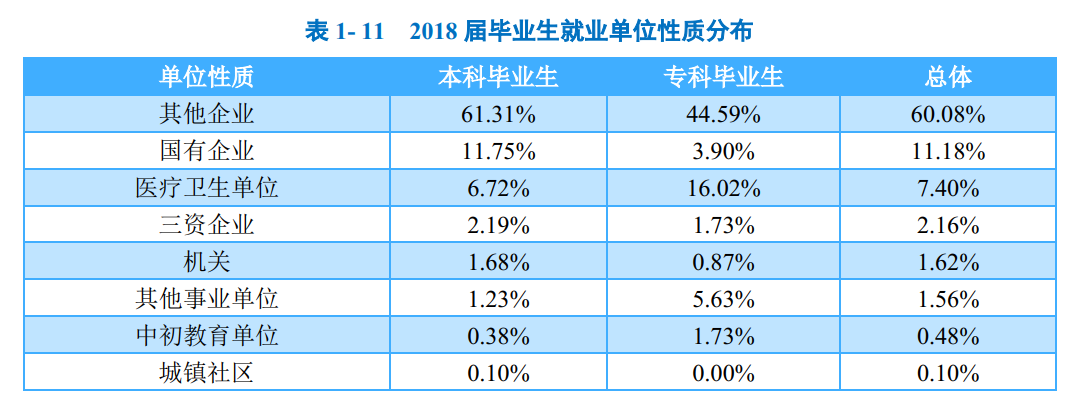 学校2018届本科毕业生单位流向较为多元,以其他企业(主要为“民营企业”)为主,占比为60.08%;“国有企业”次之,占比为11.18%。相较于专科毕业生,本科毕业生单位布局较为集中,主要签约“其他企业”,比例达61.31%;此外,专科毕业生签约其他企业及医疗卫生单位的比例相对较高,分别达44.59%、16.02%。