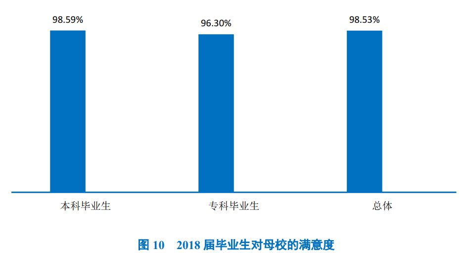 98.53%的毕业生对母校感到满意,总体满意度较高。其中,本科毕业生对母校的满意度达到98.59%,专科毕业生对母校的满意度达到96.30%。可见毕业生对母校人才培养过程及校风学风等方面均比较认同。