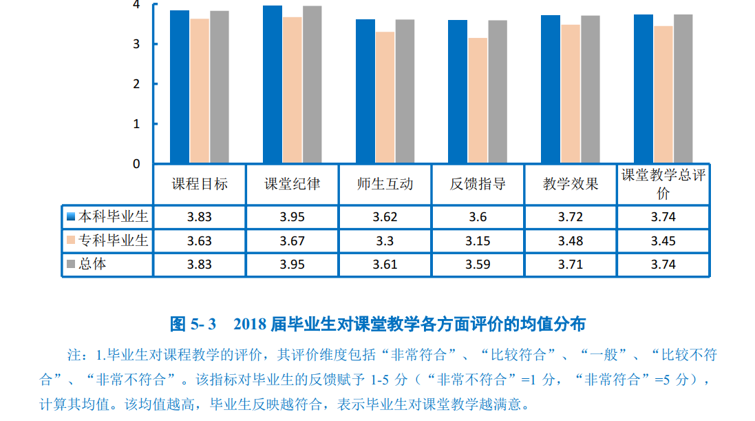 课堂教学是培养专业人才的基本环节,是高校教学中的一个重要组成部分。从整体均值来看,2018届毕业生对课堂教学总评价的均值为3.74分,可见毕业生对课堂教学偏向“比较满意”水平。