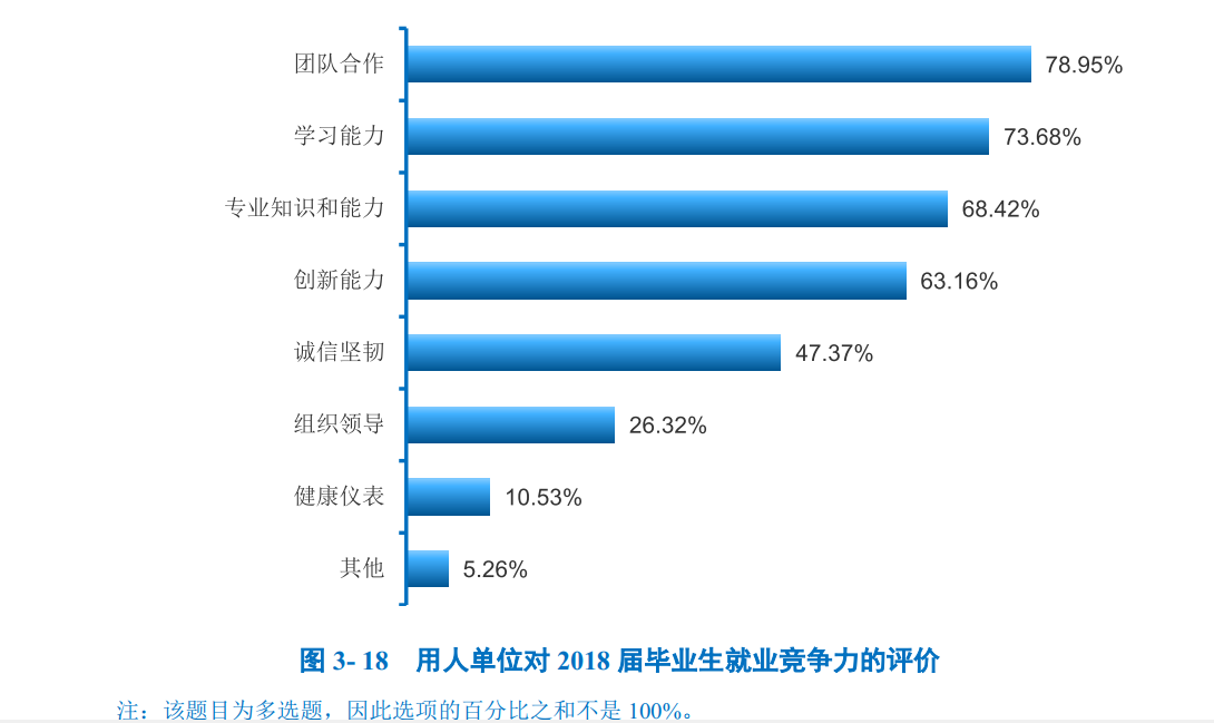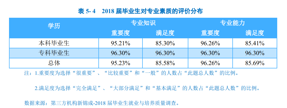 对专业素质的评价:对于目前工作需求而言,2018届本科毕业生认为专业知识和专业能力的重要度均在95.00%以上,对工作/学习的满足程度均在85.00%以上。2018届专科毕业生认为专业知识和专业能力的重要度均在96.00%以上,对工作/学习的满足程度均在96.00%以上。