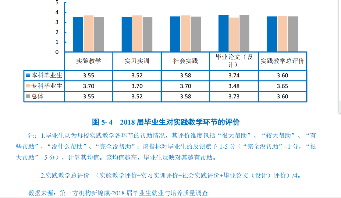 2018届本科毕业生对母校实践教学评价的综合评分为3.60分。其中,毕业生认为“毕业论文(设计)”对其帮助度较高,“社会实践”次之。