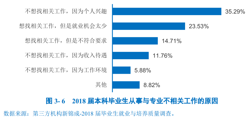 从事与专业不相关工作的原因:主要为“不想找相关工作,因为个人兴趣”(35.29%)和“想找相关工作,但是就业机会太少”(23.53%)。