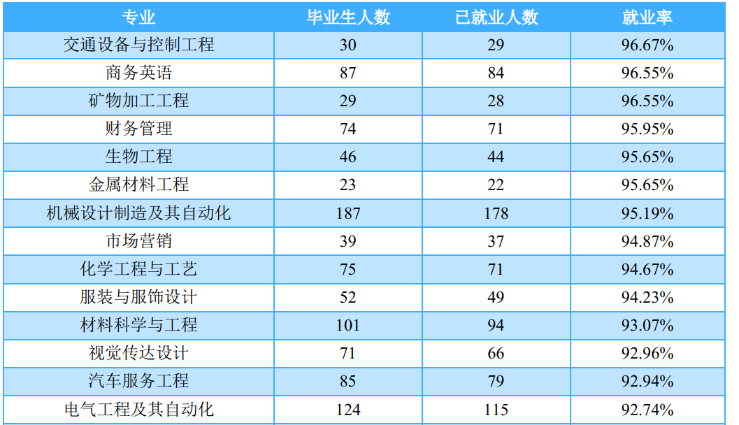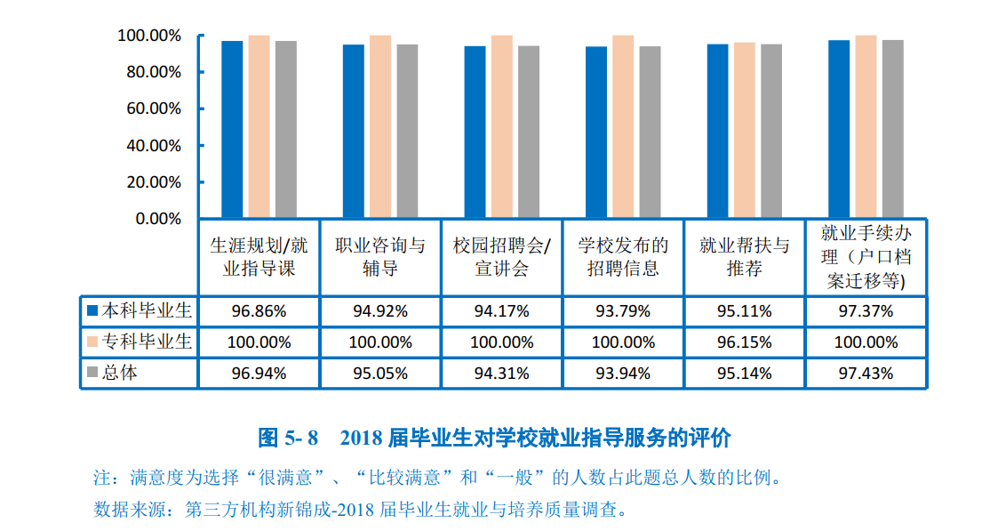 为确保毕业生较高就业率,进一步提升就业质量,学校坚持以“就业创业核心能力提升工程”为抓手,全面加强就业指导,切实开展创业教育,积极拓展就业市场,精准实施就业帮扶,努力提升服务水平,促进学生全面就业。