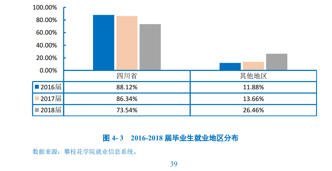 如下图所示,学校近三届毕业生在四川省内就业的比例均在73.00%以上,处于较高水平。综合来看,这一就业地区分布充分体现出学校适应基础教育改革,服务地方经济发展,为地区提供智力支持和人才保障。