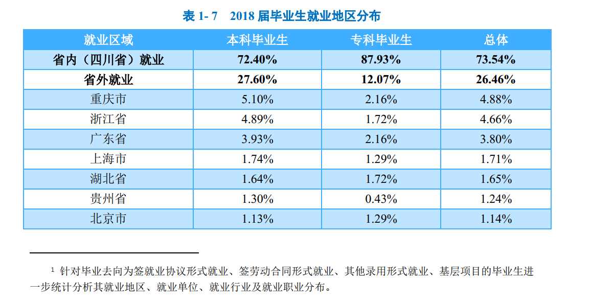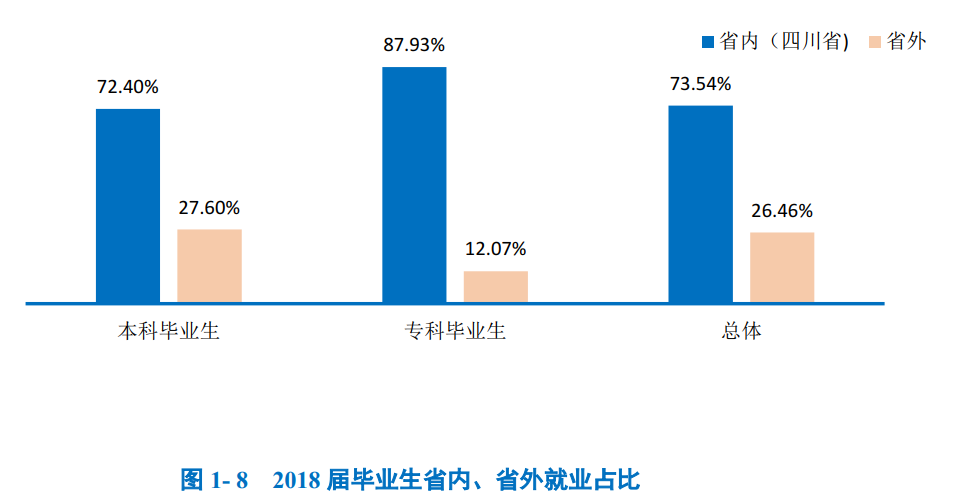 就业区域分布:四川省内为学校2018届毕业生就业主战场,占比为73.54%;其中,本科毕业生省内就业占比为72.40%,专科毕业生省内就业占比为87.93%。此外,省外就业毕业生主要流向了重庆市、浙江省和广东省,占比分别为4.88%、4.66%和3.80%。