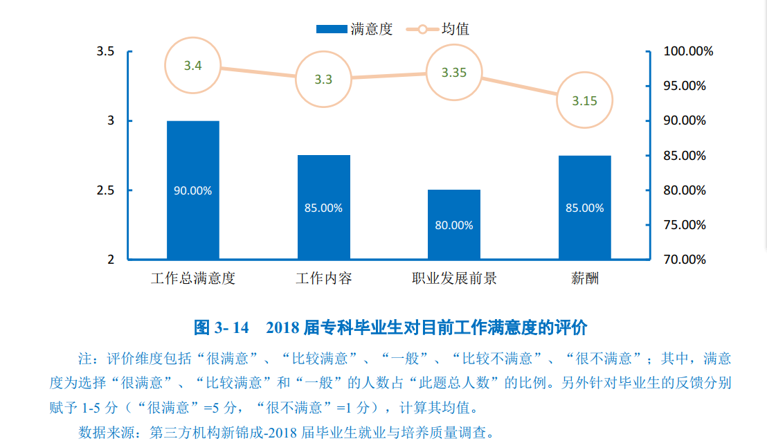 工作总体及各方面的满意度:学校2018届专科毕业生对目前工作总体的满意度为90.00%,处于较高水平;其次对工作内容及薪酬的满意度最高,均为85.00%。从均值来看,均处于3.15分及以上(5分制),处于“一般”水平之上。