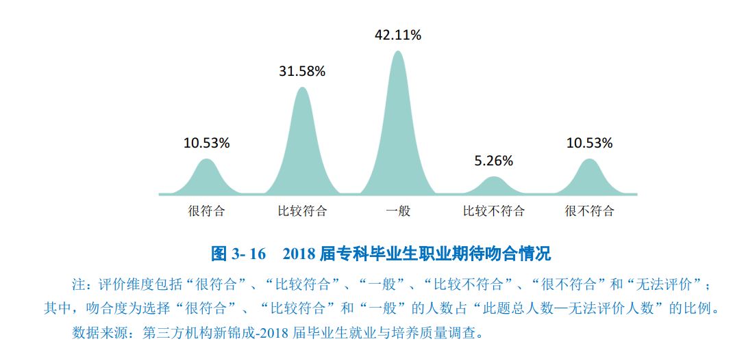 总体职业期待吻合度:2018届专科毕业生目前所从事的工作与自身职业期待的吻合度为84.21%,其中“很符合”所占比为10.53%,“比较符合”所占比例为31.58%。