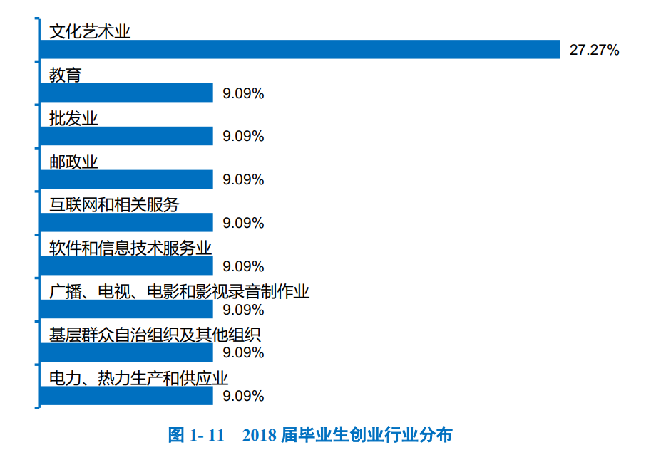 创业行业: 2018 届毕业生创业行业呈多元化分布,主要集中在“文化艺术业” 。