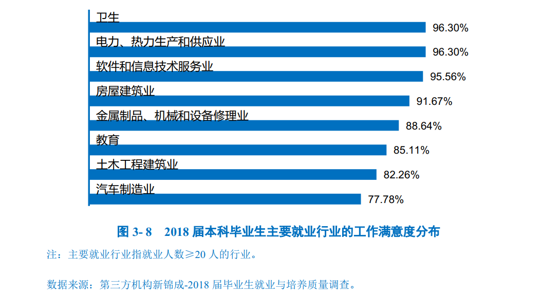 主要就业行业的工作满意度:就业于“卫生”(96.30%)、“电力、热力生产和供应业”(96.30%)的本科毕业生对目前工作总体的满意度评价相对较高;而就业于“汽车制造业”的本科毕业生对目前工作总体的满意度评价相对较低。