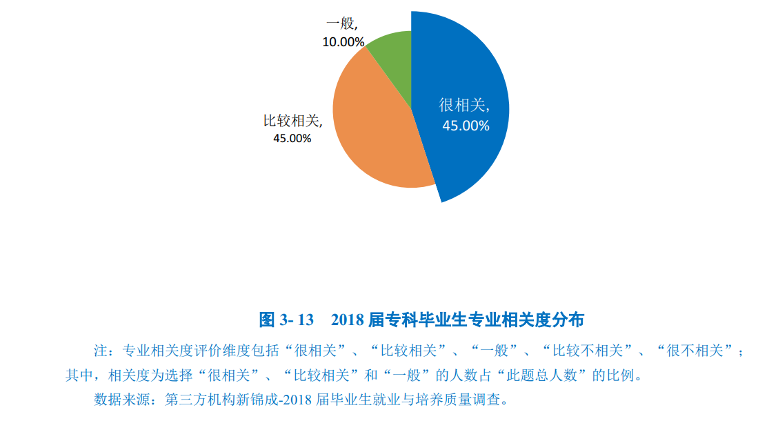 总体专业相关度:100.00%的专科毕业生认为目前就职岗位与所学专业相关,其中“很相关”占比45.00%,“比较相关”占比45.00%。“一般”占比10.00%。