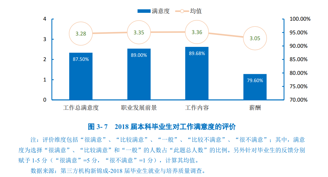 学校2018届本科毕业生对目前工作总的满意度为87.50%,处于较高水平;其中对工作内容的满意度最高,为89.68%。均值均处于3.05分及以上(5分制)。专科毕业生对目前工作总体的满意度为90.00%,处于较高水平;其次对工作内容及薪酬的满意度最高,均为85.00%。从均值来看,均处于3.15分及以上(5分制)。