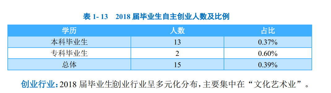 创业人数及比例:学校2018届毕业生中,共有15人选择自主创业(0.39%);其中本科毕业生13人,专科毕业生2人。