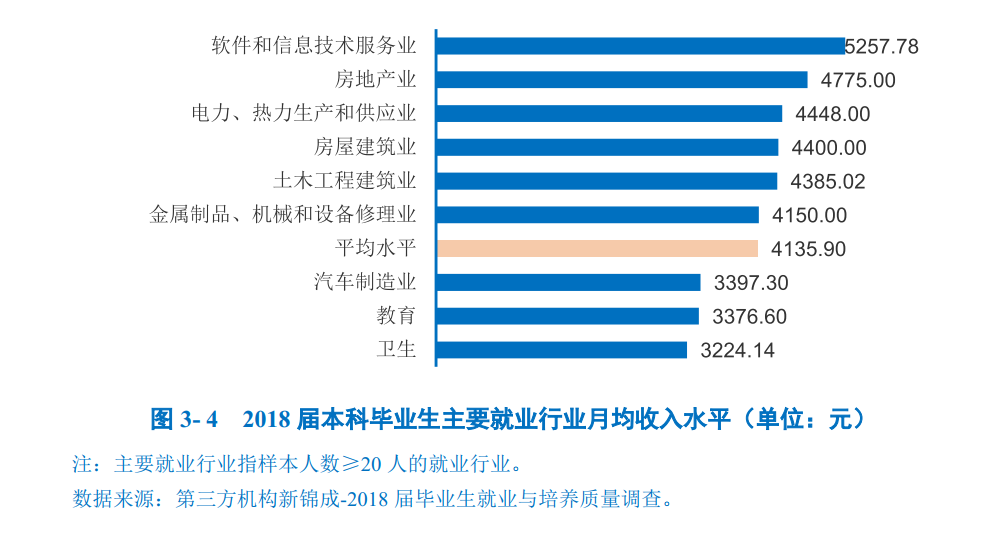主要就业行业领域月均收入:在“软件和信息技术服务业”就业的本科毕业生薪酬较高,月均收入处于5257.78元;而在“卫生”领域就业的本科毕业生月均收入水平相对较低,为3224.14元。