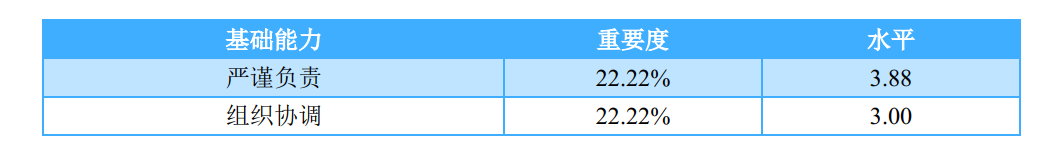 队意识、创新思维、记忆能力、主动学习、组织协调、阅读理解和善于倾听;而自身这十项基础能力素质的水平除了“表达能力”外均在3.00分及以上;其中“团队意识”的水平相对较高,均值为4.21分。